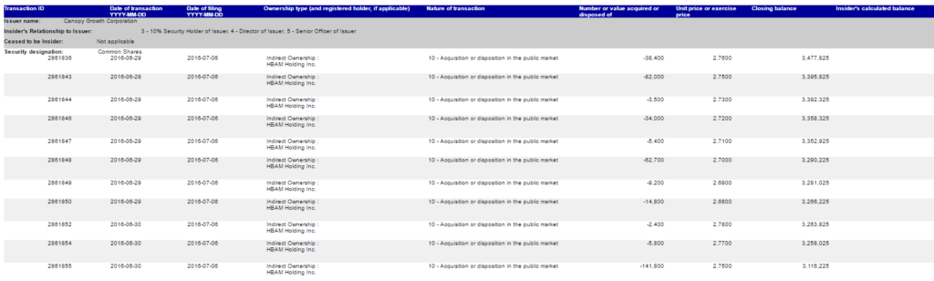 Canopy Growth (TSXV: CGC) (OTC: TWMJF) CEO Bruce Linton disposed of 400K shares of the stock at the end of June, raising approximately $1.1mm: