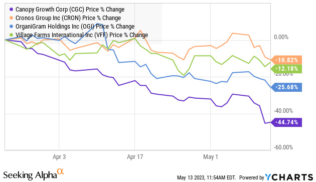 We have written about some alternatives for Canopy Growth, which we think is still overvalued despite a 54.5% decline to an all-time closing low. We suggested that investors in late March substitute Cronos Group, Organigram or Village Farms for Canopy Growth, which has been a good call so far despite all of the prices coming down: