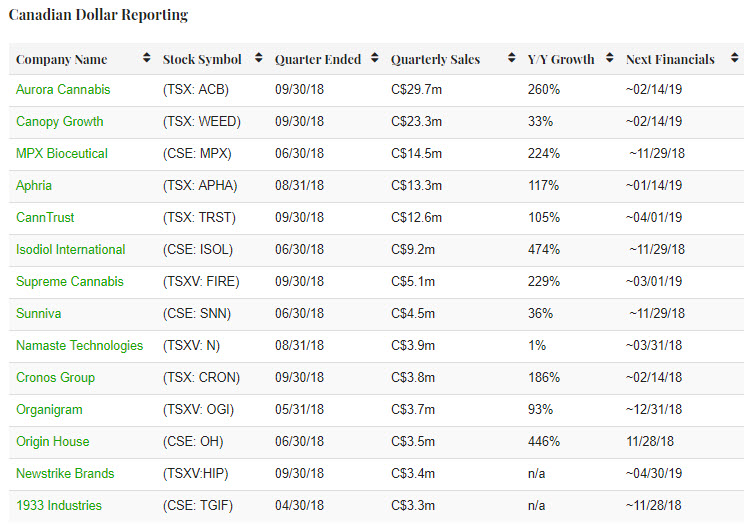 35 companies currently qualify for inclusion, with 21 filing in U.S dollars and 14 in the Canadian currency. Since our last report, we added Curaleaf (CSE: CURA) (OTC: LDVTF), Halo Labs (NEX: HALO) (OTC: AGEEF), Harvest Health & Recreation (CSE: HARV), Helix TCS (OTC: HLIX), Medicine Man Technologies (OTC: MDCL), Newstrike Brands (TSXV: HIP) (OTC: NWKRF) and Surna (OTC: SRNA). We note that Elixinol Global (ASX: EXL) (OTC: ELLXF) can’t be included at this time despite its likely qualification, as the company’s Q3 report didn’t break out the sales of CBD. Similarly, the Acreage Holdings (CSE: ACRG) Filing Statement included only year-to-date financials and not a quarterly number for revenue. We expect to be adding several additional companies, including Acreage Holdings, over the balance of 2018 as existing public companies continue to ramp up sales and as others begin to trade publicly.
