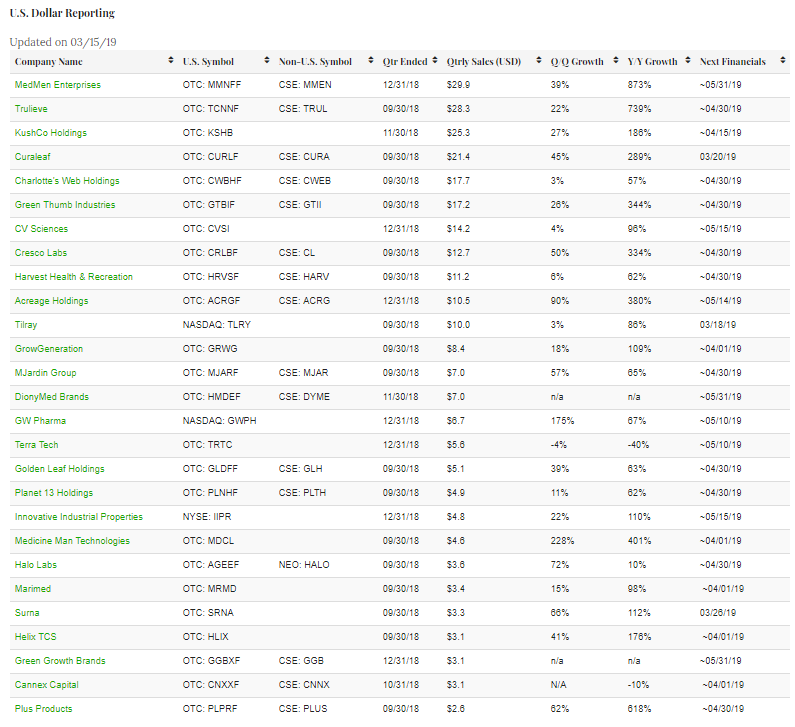 The Public Cannabis Company Revenue Tracker, managed by New Cannabis Ventures, ranks the top revenue producing cannabis stocks that generate industry sales of more than US$2.5 million per quarter. This data-driven, fact-based tracker will continually update based on new financial filings so that readers can stay up to date. Companies must file with the SEC or SEDAR to be considered for inclusion. Please note that we expect to raise the minimum quarterly revenue in April to US$5 million.