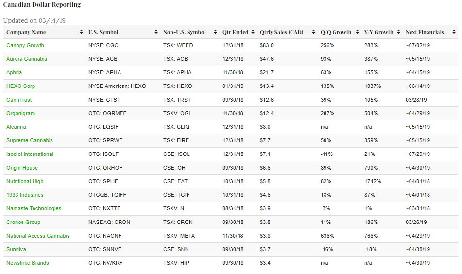 Over the balance of March, we expect reports from 1933 Industries (CSE: TGIF) (OTC: TGIFF), CannTrust (TSX: TRST) (NYSE: CTST), which hosts a call on March 28th, Cronos Group (TSX: CRON) (NASDAQ: CRON), which will host a call on March 26th, Namaste Technologies (TSXV: N) (OTC: NXTTF) and Nutritional High (CSE: EAT) (OTC: SPLIF). According to Sentieo, analysts project CannTrust will generate sales of C$21.2 million, up 68% from Q3 and 203% from a year ago. Cronos Group is expected to generate sales of C$11.4 million, up 221% from the prior quarter and 609% from a year ago.
