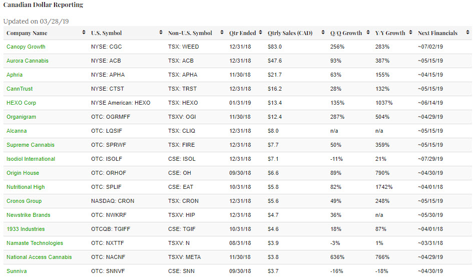 Of the companies that report in Canadian dollars, CannTrust (TSX: TRST) (NYSE: CTST) and Cronos Group (TSX: CRON) (NASDAQ: CRON) reported just last week, with both companies disappointing the market with sales that fell below expectations.