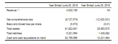 ¹During the year ended June 30, 2018, the Company did not generate revenues as its license to sell cannabis was granted on June 22, 2018.