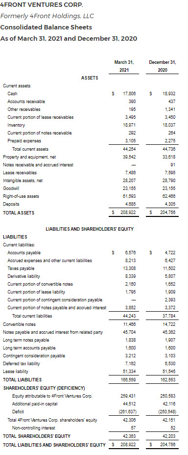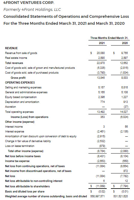 PHOENIX, Ariz., May 24, 2021 /PRNewswire/ – 4Front Ventures Corp. (CSE: FFNT) (OTCQX: FFNTF) (“4Front” or the “Company”), a vertically integrated, multi-state cannabis operator and retailer, today announced its financial results for the first quarter ended March 31, 2021. All financial information is presented in U.S. dollars unless otherwise indicated.