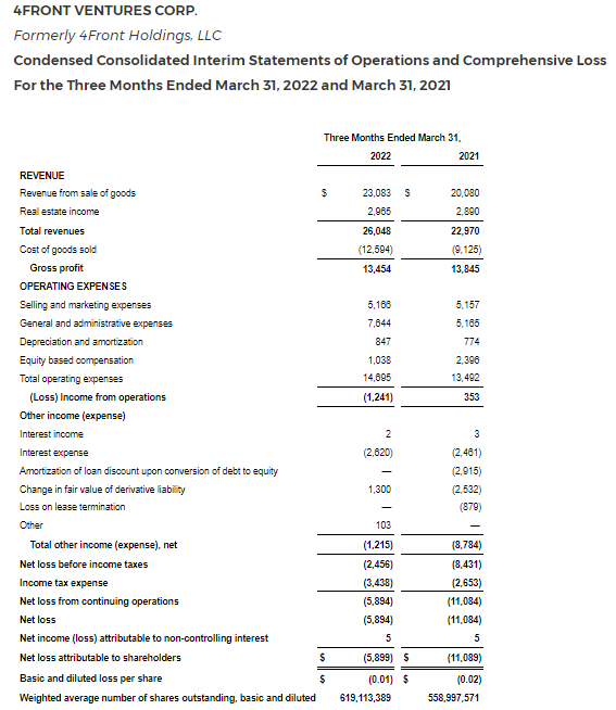 PHOENIX, May 23, 2022 /PRNewswire/ – 4Front Ventures Corp. (CSE: FFNT) (OTCQX: FFNTF) (“4Front” or the “Company”), a vertically integrated, multi-state cannabis operator and retailer, today announced its financial results for the first quarter ended March 31, 2022 (“Q1 2022”). All financial information is presented in U.S. dollars unless otherwise indicated.