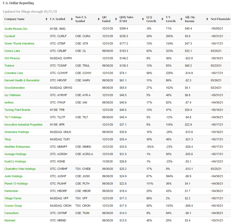 During the balance of March, we will continue to hear from some of the largest cannabis operators as well as many others, and these companies are expected to have experienced very strong growth during Q4. Several companies are now filing with the SEC, and their reports are due in March, while the balance of year-end reports will be due by the end of April for those companies still using IFRS accounting instead of U.S. GAAP. The remaining companies that will be reporting in March and that generated more than $25 million in revenue in Q3 include Cresco Labs (CSE: CL) (OTC: CRLBF), Trulieve (CSE: TRUL) (OTC: TCNNF), Harvest Health and Recreation (CSE: HARV) (OTC: HRVSF), GrowGeneration (NASDAQ: GRWG), Greenlane (NASDAQ: GNLN) and Charlotte’s Web (TSX: CWEB) (OTC: CWBHF).