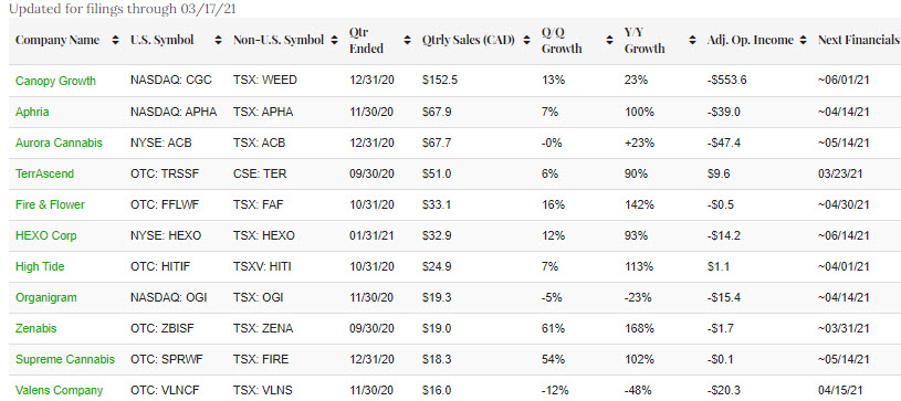 The Public Cannabis Company Revenue & Income Tracker, managed by New Cannabis Ventures, ranks the top revenue producing cannabis stocks that generate industry sales of more than US$12.5 million per quarter (C$15.9 million). This data-driven, fact-based tracker will continually update based on new financial filings so that readers can stay up to date. Companies must file with the SEC or SEDAR and be current to be considered for inclusion. Please note that we have raised the minimum quarterly revenue several times as the industry has scaled up, including from US$10.0 million in November 2020, US$7.5 million in June 2020, US$5.0 million in October 2019 and US$2.5 million in May 2019.