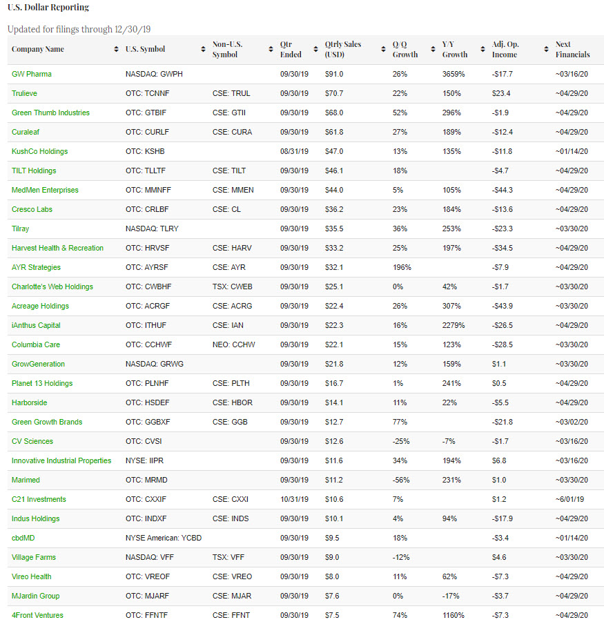 The Public Cannabis Company Revenue & Income Tracker, managed by New Cannabis Ventures, ranks the top revenue producing cannabis stocks that generate industry sales of more than US$7.5 million per quarter. This data-driven, fact-based tracker will continually update based on new financial filings so that readers can stay up to date. Companies must file with the SEC or SEDAR to be considered for inclusion. Please note that we raised the minimum quarterly revenue in May from US$2.5 million and from US$5.0 million in October.