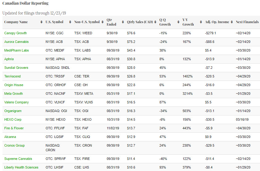 Canadian Dollar Reporting – Public Cannabis Company Revenue Tracker