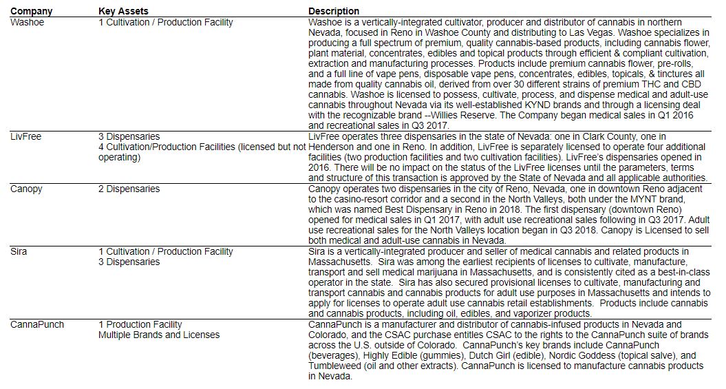 The Transaction, upon closing, when final regulatory approvals are received from all applicable jurisdictions, will create a combined enterprise with a strong combination of high-quality assets anchoring the Eastern and Western United States. Assuming closing of the Transaction, CSAC will own three cultivation and production facilities, a facility dedicated to cannabis goods manufacturing, and 8 dispensaries, in addition to key licenses. Summary information, by Target Business, is summarized below: