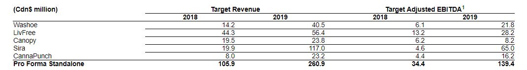 - Target pro forma revenue of Cdn.$100–110 million for 2018, targeted to grow to Cdn.$250–270 million for 2019 (excluding additional acquisitions)