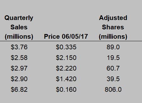 Kush Bottles (OTC: KSHB) is a compliant packaging solutions provider operating in many markets. The company reported FY17-Q2 sales of $2.97mm, up 65% from a year ago (and YTD sales of $5.44mm, up 55%). The operating income was $3619, with the company using $38K to fund its operations. The company reported 50.19mm shares as of April 11, but my adjusted share-count factors in options as well as an acquisition reported after the quarter. KSHB reported equity of $7.85mm, including goodwill of $2.38mm.