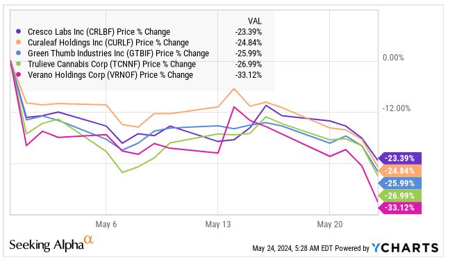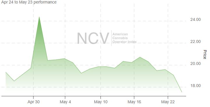 We thought the largest MSOs were running up too much and pointed this out to our readers several times. Verano Holdings is actually down 6.3% in 2024, but the rest are up, especially Trulieve. The New Cannabis Ventures Global Cannabis Stock Index, which includes MSOs but also other types of cannabis stocks, is now up 17.6% in 2024. The NCV American Cannabis Operator Index is up less! It has returned 14.3%, and it is down 28.0% since April 30th. Here is the past month in that index: