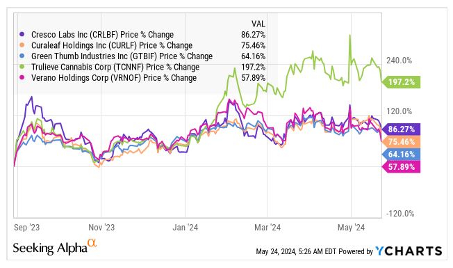Investors made a big bet, but that bet has gone bad for many. I have talked about the gambling table here and elsewhere: AdvisorShares Pure US Cannabis ETF (NYSE Arca: MSOS). That ETF is up 16.0% year-to-date, but it has dropped 27.8% since April 30th. The ETF, which is focused solely on MSOs, has very limited exposure to most of them, as it has 82.7% in just the five Tier 1 names.