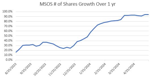MSOS has seen its share-count increase 38% in 2024 so far, and it has increased over 93% over the past year: