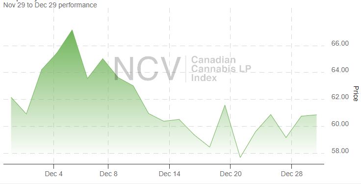 The Canadian Cannabis LP Index was very strong to begin the year, but it has been weak since then. In December, it dropped 0.9% to 60.85: