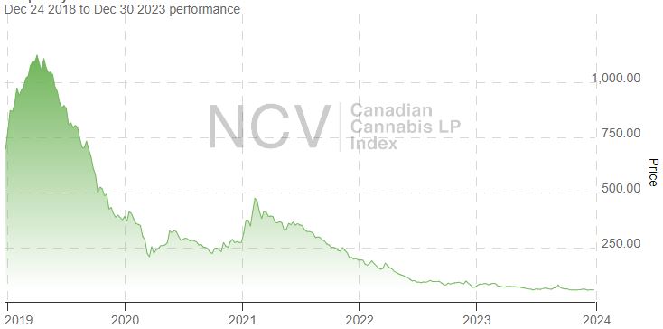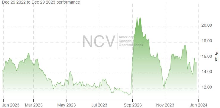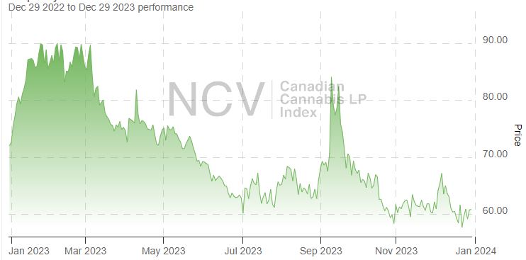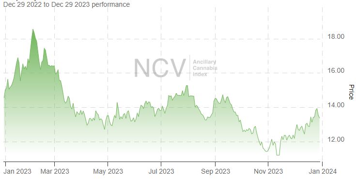In Q4, the index lifted 0.9%. After a massive loss of 76.6% in 2022 to 15.02, it declined 10.9% in 2023, which was better than the Global Cannabis Stock Index: