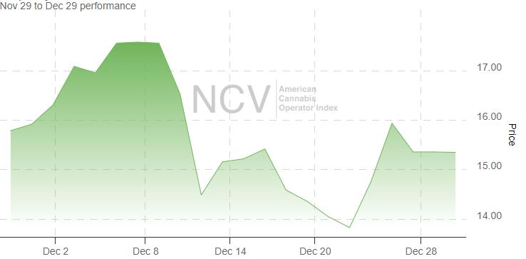 The American Cannabis Operator Index was crushed in October and then partially reversed in November as the strongest sub-sector. In December, it fell 3.6% to 15.34 :