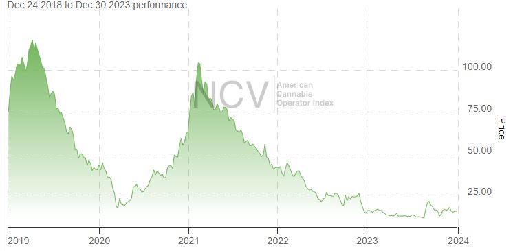 As we described in a previous article, the Global Cannabis Stock Index extended the November bounce after the huge October loss, rallying 8.1% in December. That index was down 20.1% in 2023, which followed a record decline of 70.4% for 2022.