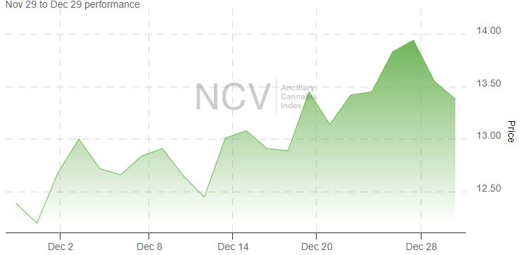 The Ancillary Cannabis Index was stronger than the Global Cannabis Stock Index, rising 9.7% to 13.38: