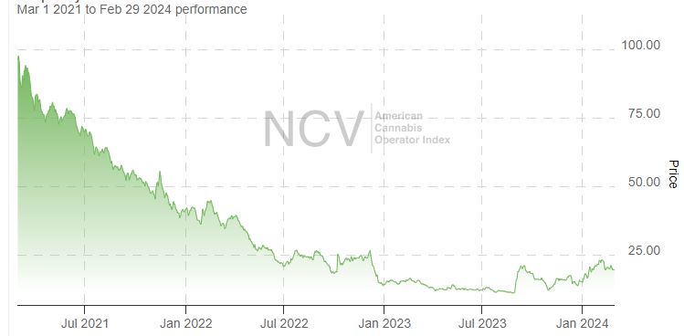 Even after the big pullback in February of 9.2%, the New Cannabis Ventures American Cannabis Operator Index was still up 27.2% year-to-date through the end of February. This big rally is on top of the rally in 2023 of 7.6%. So, through the end of February, the index gained 36.9% from the end of 2022. The NCV Global Cannabis Stock Index has declined 11.9% during that same period of time.
