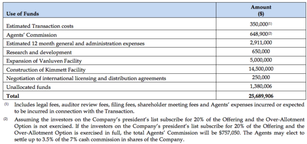 The additional funds will largely be allocated towards additional developments in connection with the expansion of the Vanluven Facility. The following table sets out information respecting the Company’s intended principal uses of funds for the 12 months following the completion of the Transaction. The intended uses of funds may vary based upon a number of factors and variances may be material. The amounts shown in the table are estimates only and are based upon the information available to the Company and ABcann as of the date hereof:
