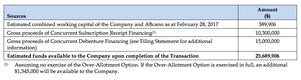 The following table sets out information respecting the Company’s expected sources of cash following the completion of the Transaction. The amounts shown in the table are estimates only and are based upon the information available to the Company and ABcann as of the date hereof: