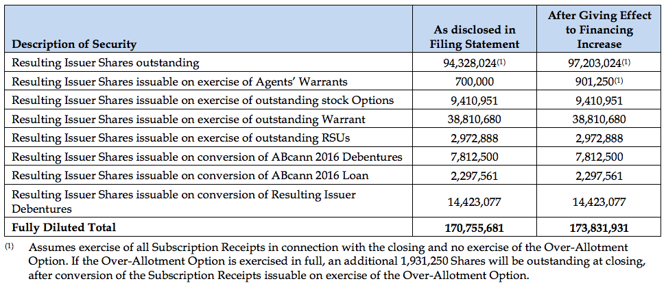 The table below sets out the differences in the fully diluted share capital of the Company after giving effect to the increase to the Financing, as compared to the disclosure included in the Filing Statement. For additional information with respect to the amounts set out in the table below, please refer to the section entitled “Information Concerning the Resulting Issuer – Fully Diluted Share Capital” in the Filing Statement.