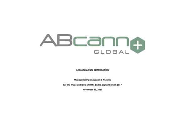 For the quarter ended September 30, 2017, ABcann reported revenues of $177K, and a net loss of $3.7 million as the Company continued to invest to drive future growth. As at September 30, 2017, the Company had $43.4 million in cash, cash equivalents and marketable securities, and 126.1 million common shares outstanding, and there are approximately 135.7 million shares outstanding as at the date hereof.