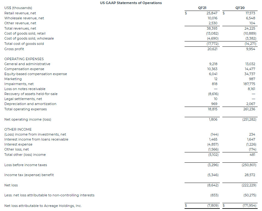 - Net loss attributable to Acreage in the second quarter of 2021 was $2.6 million, an improvement from the net loss attributable to Acreage of $37.2 million for the same period in 2020.