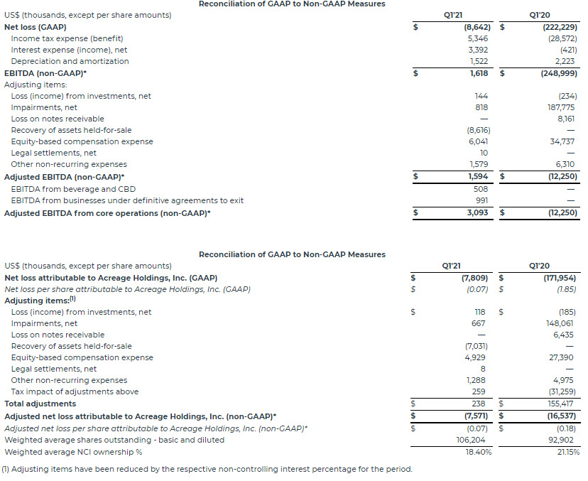 This release contains tables that reconcile our results of operations reported in accordance with accounting principles generally accepted in the United States of America (“GAAP”) to adjusted results that exclude the impact of certain items identified as affecting comparability (non-GAAP). We use EBITDA, adjusted EBITDA, adjusted EBITDA from core operations, adjusted net loss attributable to Acreage, same store sales trends, among other measures, to evaluate our actual operating performance and for planning and forecasting future periods. We believe the adjusted results presented provide relevant and useful information for investors because they clarify our actual operating performance, make it easier to compare our results with those of other companies and allow investors to review performance in the same way as our management. Since these measures are not calculated in accordance with GAAP, they should not be considered in isolation of, or as a substitute for, our reported results as indicators of our performance, and they may not be comparable to similarly named measures from other companies. The tables below reconcile our results of operations in accordance with GAAP to the adjusted results mentioned above: