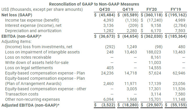 - Adjusted EBITDA* in the fourth quarter was a loss of $3.5 million compared to a loss of $18.3 million in the same period in 2019.