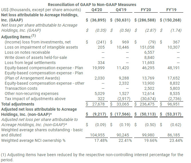 This release contains tables that reconcile our results of operations reported in accordance with accounting principles generally accepted in the United States of America (“GAAP”) to adjusted results that exclude the impact of certain items identified as affecting comparability (non-GAAP). We use EBITDA, adjusted EBITDA, adjusted net loss attributable to Acreage, same store sales trends, among other measures, to evaluate our actual operating performance and for planning and forecasting future periods. We believe the adjusted results presented provide relevant and useful information for investors because they clarify our actual operating performance, make it easier to compare our results with those of other companies and allow investors to review performance in the same way as our management. Since these measures are not calculated in accordance with GAAP, they should not be considered in isolation of, or as a substitute for, our reported results as indicators of our performance, and they may not be comparable to similarly named measures from other companies. The tables below reconcile our results of operations in accordance with GAAP to the adjusted results mentioned above: