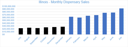 In July 2020, Cannabis sales in Illinois’ medical and adult use channels totaled $94.2 million, growing 22 percent since June. Year-to-date through July, sales have reached $504.4 million.