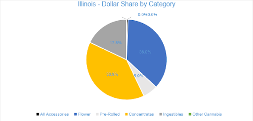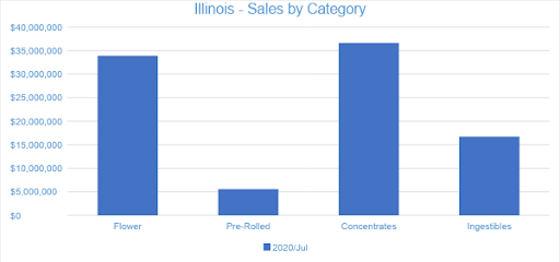 The Concentrates category, which was the largest segment of the Illinois cannabis market, accounted for 39 percent of total July revenues with sales reaching $36.6 million for the month. Vape products, the largest segment of the Concentrates category, generated $28.5 million, accounting for 78 percent of the Illinois Concentrates market and 30 percent of sales across all categories.