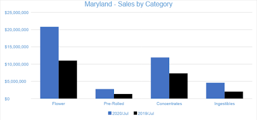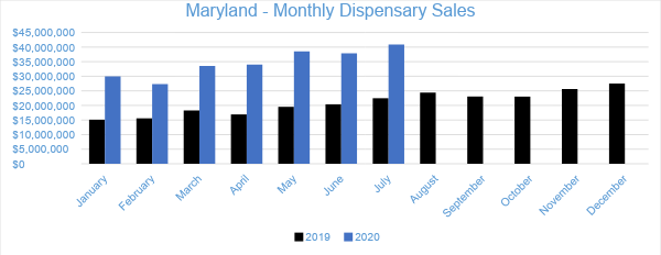 In July 2020, Cannabis sales in Maryland’s medical dispensaries reached $40.9 million, growing by eight percent from June and by more than 82 percent compared to the previous July. Year-to-date through July, sales reached $242.2 million, representing a $113.6 million increase from the same period last year.