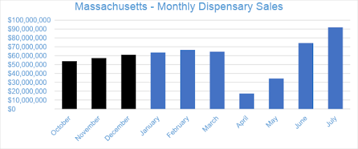 In July 2020, Cannabis sales in Massachusetts’s adult use and medical channels reached a combined $92 million, growing by 24 percent since June. Year-to-date through July, total market sales have exceeded $412.7 million.