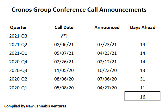 Cronos Group is a large accelerated filer with the SEC, which means its Q3 financials are due on Tuesday, November 9th. Historically, the company has provided investors with at least a week’s advance notice of its conference call, but there has been no call announced yet.