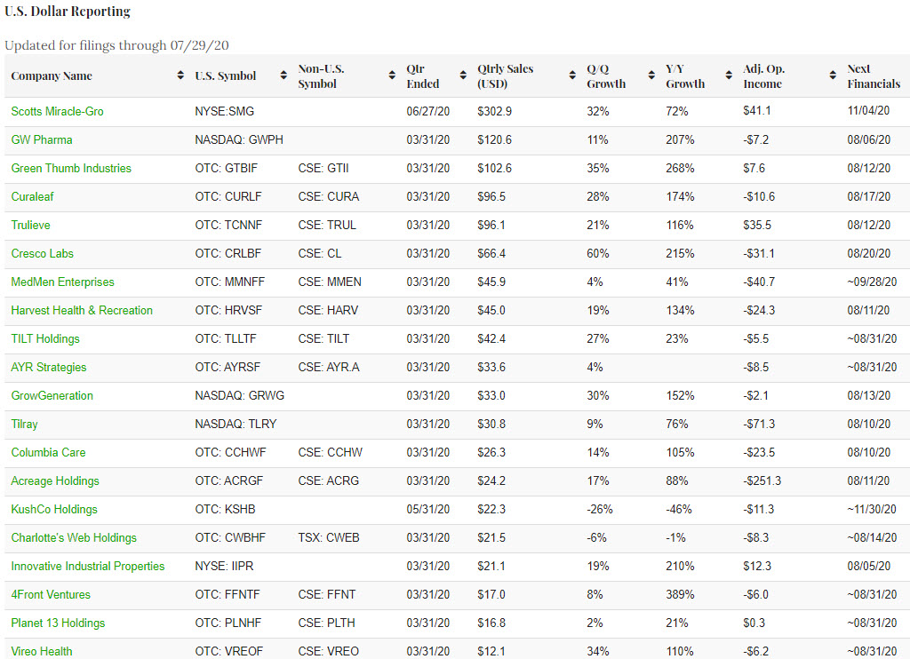In the first half of August, some of the largest companies by revenue will be providing financial updates for the quarter ending June 30, including GW Pharma (NASDAQ: GWPH), Green Thumb Industries (CSE: GTII) (OTC: GTBIF), Curaleaf (CSE: CURA) (OTC: CURLF) and Trulieve (CSE: TRUL) (OTC: TCNNF). Other companies that reported revenue in excess of $25 million in the prior quarter include Harvest Health & Recreation (CSE: HARV) (OTC: HRVSF), GrowGeneration (NASDAQ: GRWG), Tilray (NASDAQ: TLRY) and Columbia Care (CSE: CCHW) (NEO: CCHW) (OTC: CCHWF).