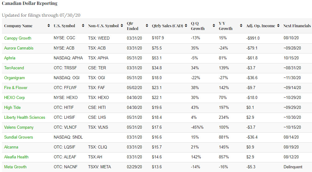 34 companies currently qualify for inclusion, with 20 filing in U.S. dollars and 14 in the Canadian currency, which is down from 35 when we reported at the end of June. In the U.S., we removed C21 Investments (CSE: CXXI) (OTC: CXXIF), which fell below the threshold. Some companies have taken advantage of revised filing deadlines that have been extended due to the pandemic, and we expect to see some delays as we enter the calendar Q2 reporting season. We also expect to add a few names to the rankings.