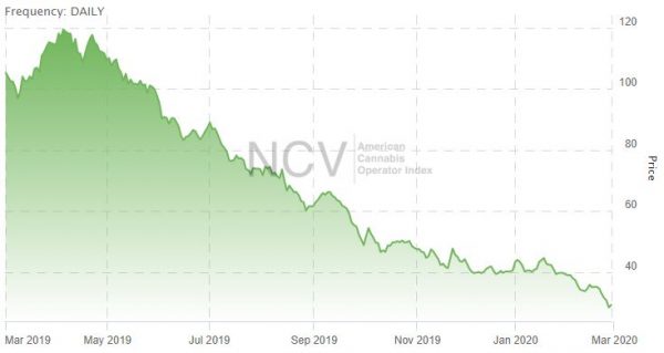 The American Cannabis Operator Index fell again for the eleventh consecutive month, declining 25.5% to 29.24, its lowest monthly close since inception: