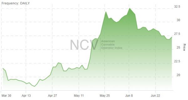 After soaring nearly 35% in May, the American Cannabis Operator Index pulled back in June, decreasing 9.8% to 27.25: