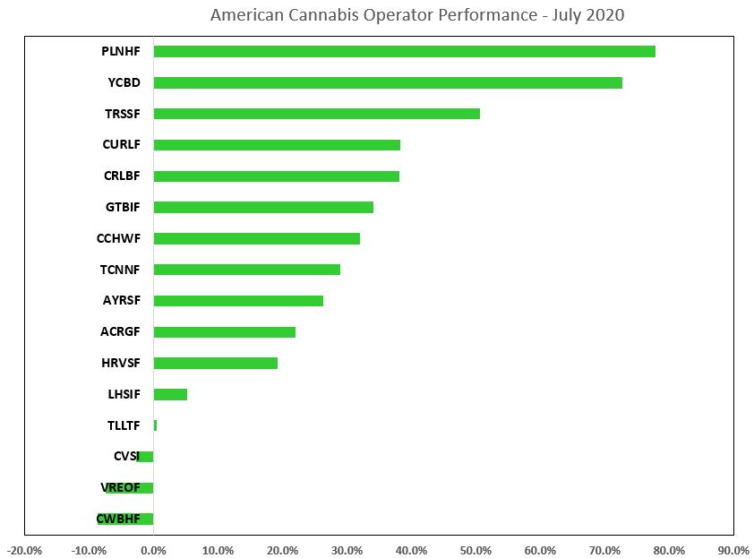 The four best performing stocks included Planet 13 Holdings, (CSE: PLTH) (OTC: PLNHF), cbdMD (NYSE American: YCBD), TerrAscend (CSE: TER) (OTC: TRSSF) and Curaleaf Holdings (CSE: CURA) (OTC: CURLF). Planet 13 was the second best performer in June and is now up more than 43% in 2020. The company further expanded its own branded products during the month and announced the pending acquisition of an additional cultivation and production facility in Las Vegas. cbdMD was among the strongest performers for the third month in a row and is now up 46% year-to-date. During July, it announced two celebrity marketing sponsorship partners. TerrAscend, which is up more than 46% year-t0-date, opened its fourth The Apothecarium dispensary in Northern California, in Berkeley, its first in the East Bay. It will be hosting an Investor Day on August 6th, an event that will include a moderated fireside chat with David Klein, the CEO of strategic investor Canopy Growth. Curaleaf Holdings, which posted a small gain during the challenging month of June, closed the acquisition of Grassroots Cannabis. The stock has rallied almost 34% in 2020.