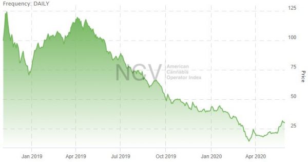 Following twelve consecutive monthly declines and then a modest gain in April, the American Cannabis Operator Index extended its rally off of its all-time low set in March, increasing 34.7% to 30.20 during May: