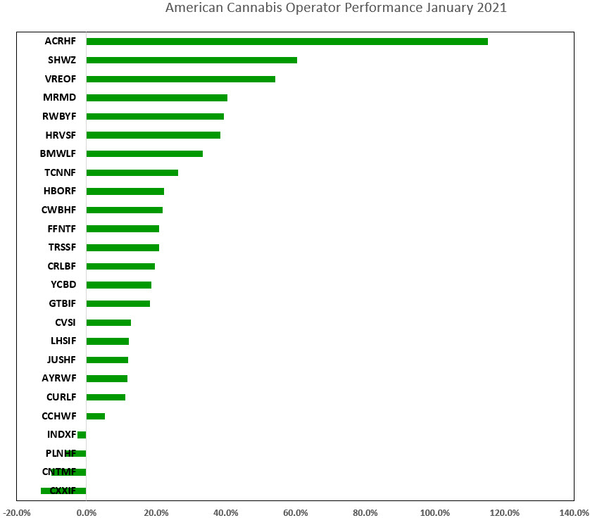 The four best performing stocks in January included Acreage Holdings (CSE: ACRG.A) (OTC: ACRHF), Schwazze (OTC: SHWZ), Vireo Health (CSE: VREO) (OTC: VREOF) and MariMed (OTC: MRMD). With the exception of Vireo Health, these were all poor performers in December and in 2020, so there was a bit of bottom-fishing perhaps. Acreage Holdings rallied on the strength of its potential merger partner, Canopy Growth, as well as perceived higher odds that the transaction could take place sooner given the change in control of the Senate. Schwazze, which declined 44% in 2020 when it failed to close several pending acquisitions, jumped late in the month. Vireo Health, a big winner in 2020, gained after New York, where it is one of ten license-holders, introduced legislation that would legalize adult-use sales. MariMed, which lost 24% in 2020, extended its gains from a late November rally.