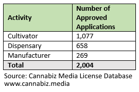 As of November 15, there are a total of 2,004 approved medical marijuana applications, half of which are cultivators as seen below in the table which breaks down the number of approved applications by activity.