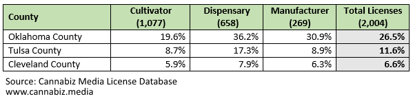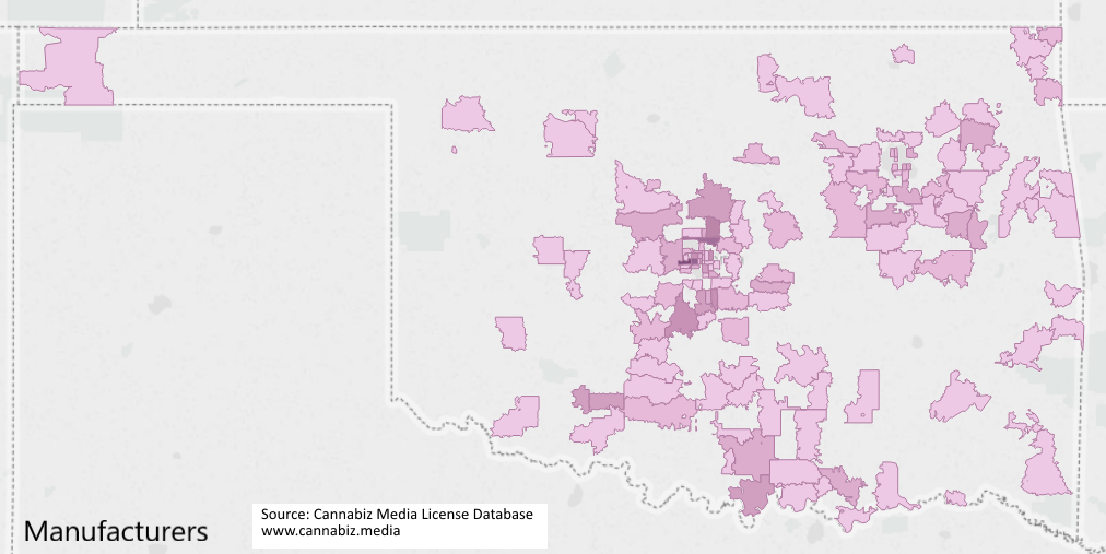 The cultivators are widely spread through the state with Oklahoma City and Tulsa followed by Edmond City having the largest totals. There are significantly fewer manufacturers and dispensaries and these are less dispersed throughout the state however the dominance in Oklahoma City, Tulsa and Edmond still exists.