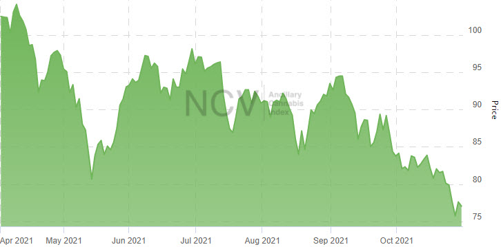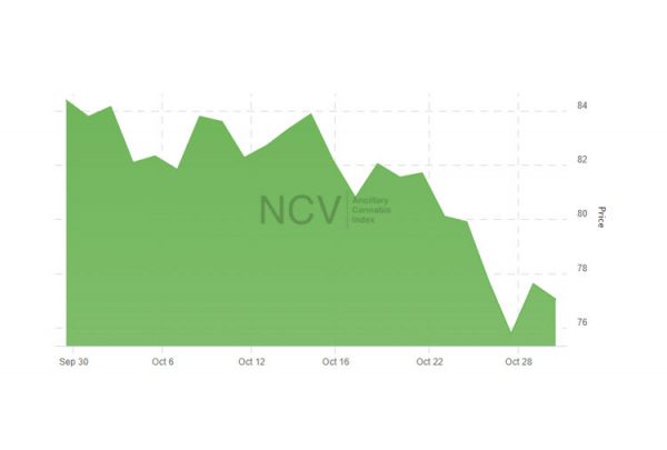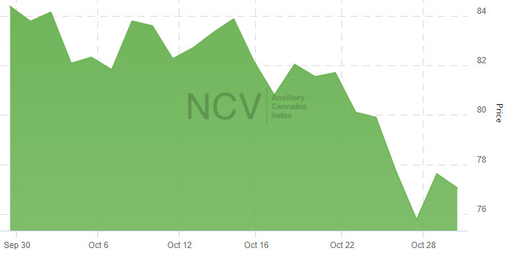The index continued to outpace the overall market in October, falling 8.0% to 77.05, slightly better than the 8.8% decline in the New Cannabis Ventures Global Cannabis Stock Index: