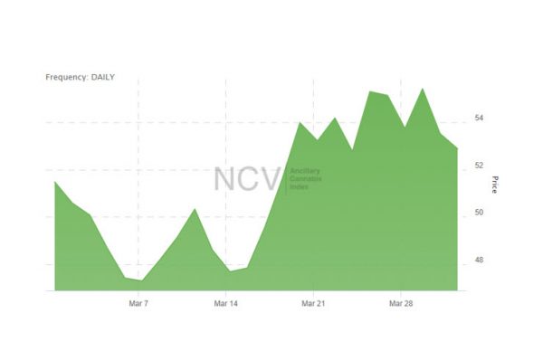 The Ancillary Cannabis Index bounced back from a weak beginning to the year, advancing 2.7% in March to 52.89: