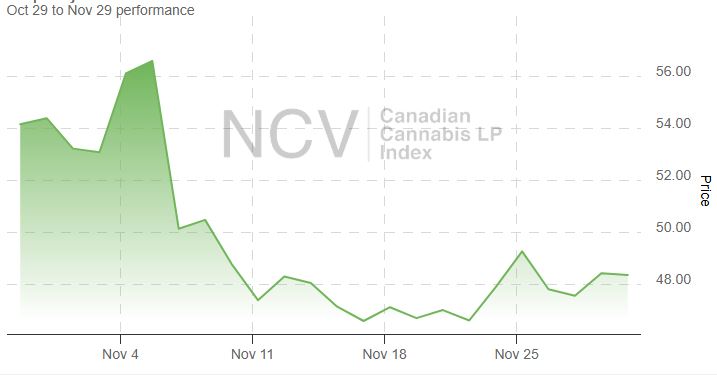 The Canadian Cannabis LP Index exploded higher in April from an all-time low set at the end of March and then plunged in May and fell further in June. In July, it posted a gain, but it fell in August and posted a new all-time low. The index moved lower in September, dropping during the month despite the overall cannabis sector advancing, but it moved modestly higher in October. In November, it set another all-time low during the month, decreasing by 7.7% to 49.11: